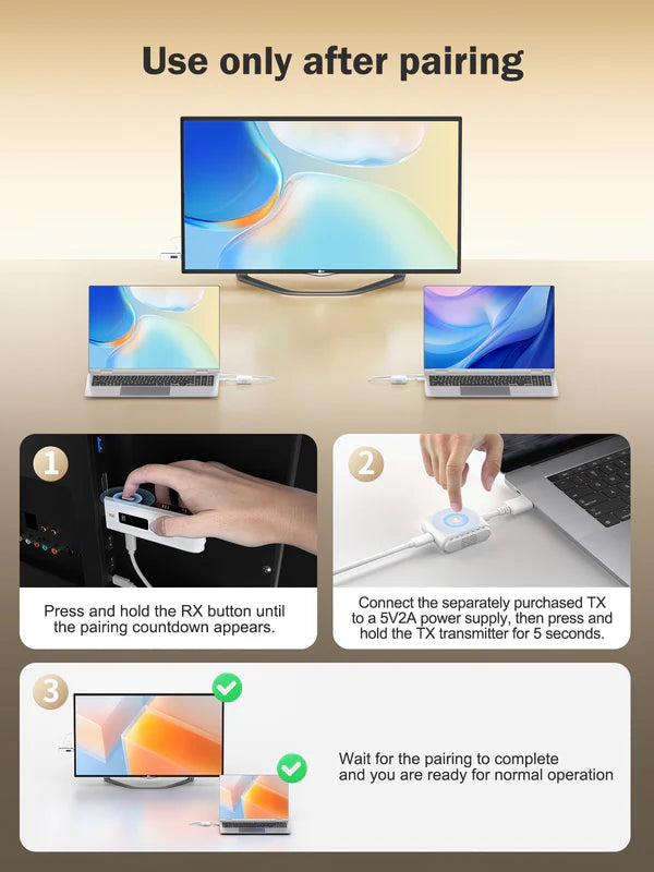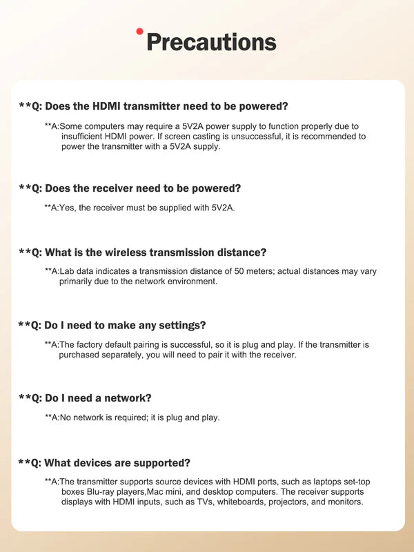 Some computers may require a 5V2A power supply to function properly due to insufficient HDMI power. If screen casting is unsuccessful, it is recommended to power the transmitter with a 5V2A supply.