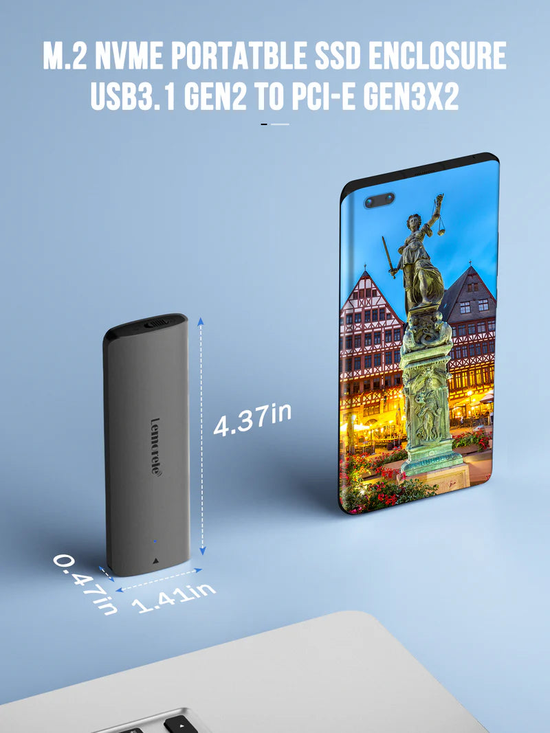 - 【NVMe USB SSD Aluminum USB Adapter】: M.2 NVMe SSD Lemorele USB 3.1 Gen 2 Adapter easily transfers internal NVMe M.2 PCI-e SSD adapter into an external USB C portable hard drive for ultra-fast data transmission, memory expansion, file backup, data recovery, system upgrade and cl. onation of the disc. It is especially perfect for home office or work from home.