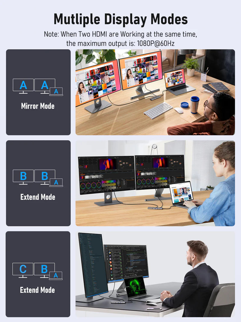 3. This device is an ideal gadget for video editors, photographers, and programmers. Supports SST and MST modes. On Apple Mac OS, two HDMI can only be displayed simultaneously