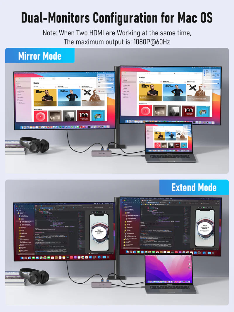 1. 2 HDMI interfaces can output 2 video signals to 2 monitors and provide you with more stable performance. No drivers or software required, just plug and play. Support extended mode or mirror mode